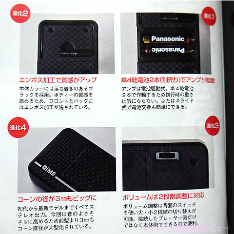 「本誌付録スピーカーに第3弾が登場した。デザインはシックかつ重厚に刷新。初の電池駆動式アンプの搭載により温室も大幅なグレードアップを遂げた。( DIME01月号より)」 【画像】 進化ポイント |