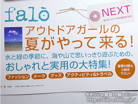 2011年 初夏発売予定のfalo (ファーロ) 第4号 豪華付録もつくようです。 |