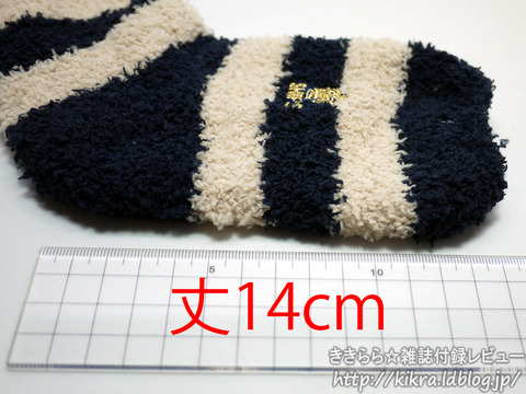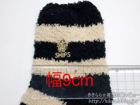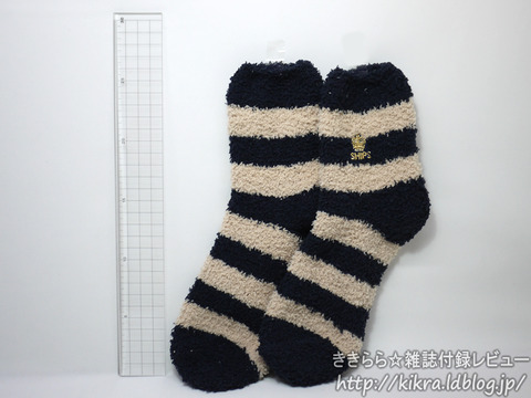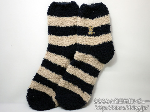 1975年創業のセレクトショップSHIPS(シップス)コラボの付録です。付録内容はシップスらしい大人っぽい配色のボーダー柄ソックスで、ブランドファンには嬉しいアイテム。素材にポリウレタンが入っていないので、履くと生地が伸びっぱなしな予感がしますが、厚みがあるからワンシーズン使い倒せるくらいのもの。ソックスを取り出したり、裏返したときに毛玉ごみが出たので広げるときにご注意ください。、