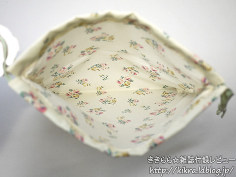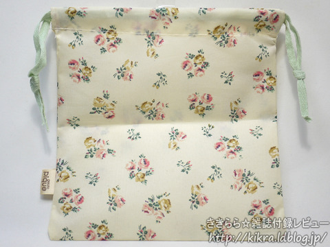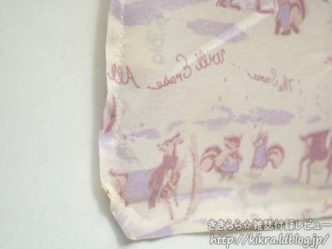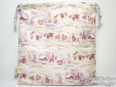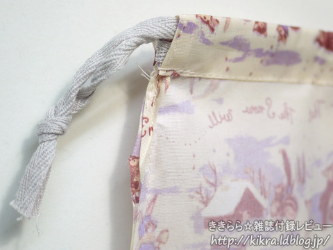 巾着の素材は硬めの綿ポリで、柄デザインとの相性は良いんですけど巾着ヒモを絞るときはちょっと手強い。あと、タオルなど織製品の出し入れがあんまりスムーズじゃないとか、断ち切りのみで解れてくるなど、製品ではない付録止まりな感じです。ジェラピケの生地がたまらなく可愛いので、サテン地の裏地をつけて自分向けにクラスアップしたいと思います。