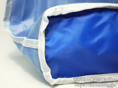 バッグをポケッタブルにするときは、収納ケース内にバッグが収まるようにはやや詰め入れる感じだけど、バッグの生地が薄手だから畳むのがカンタンです。バッグ持ち手は、本体へ折り込んで縫われているのでそこそこ重い荷物でもいけそう。試しにペットボトル約6kgを入れてみましたところ、持ち手と本体の付近生地が突っ張って薄く見えてるけど、短時間なら余裕で持ち歩けそうでした。