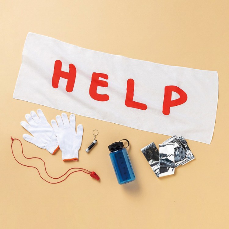 軍手、ライト、ホイッスル、アルミブランケット、HELP文字がプリントされた手ぬぐいがボトルに収納されています。