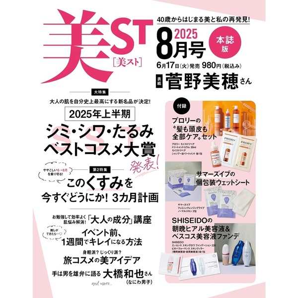 発売日:2025年6月17日 光文社 美ST (ビスト) 2025年 8月号 980円(税込) 《付録》 プロリーの“髪も頭皮も全部ケア”セット サマーズイヴの個包装ウェットシート SHISEIDOの朝晩ヒアル美容液&ベスコス美容液ファンデ |